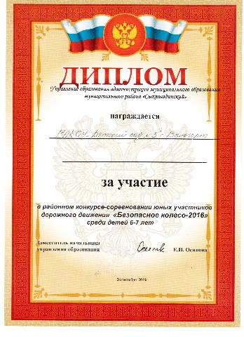 Диплом участника Районного конкурса-соревнования юных участников дорожного движения "Безопасное колесо 2016" среди детей 6-7 лет |